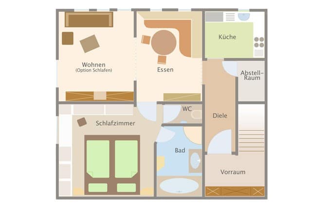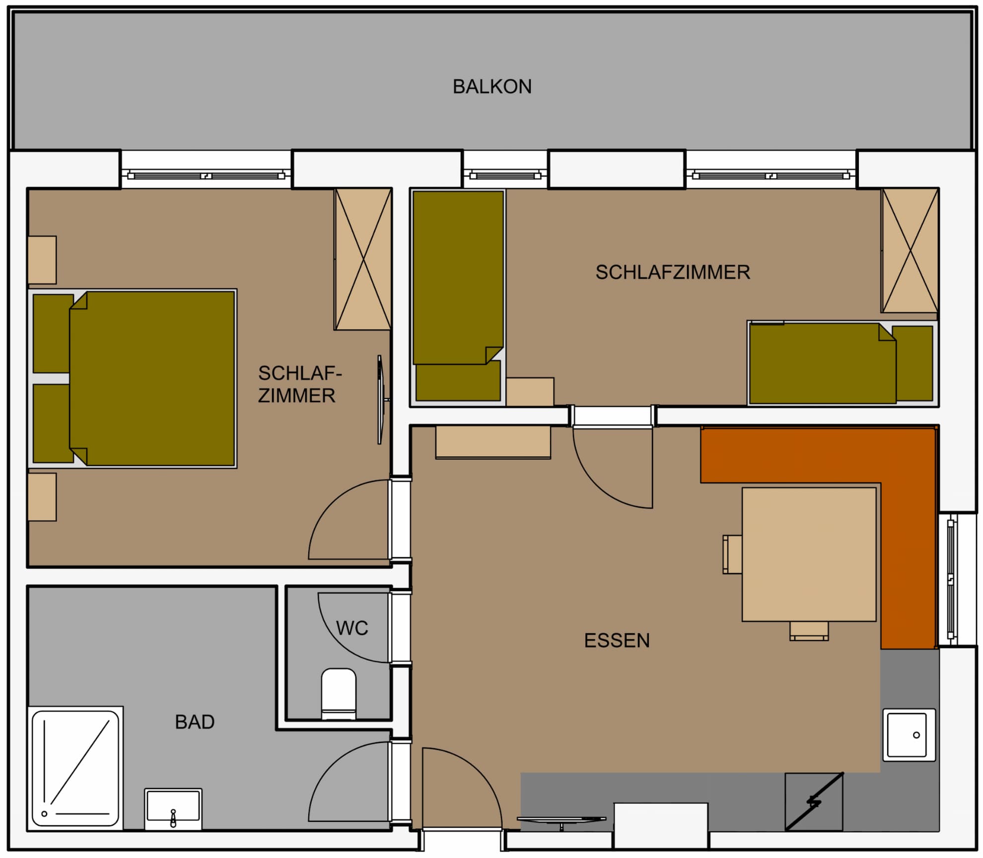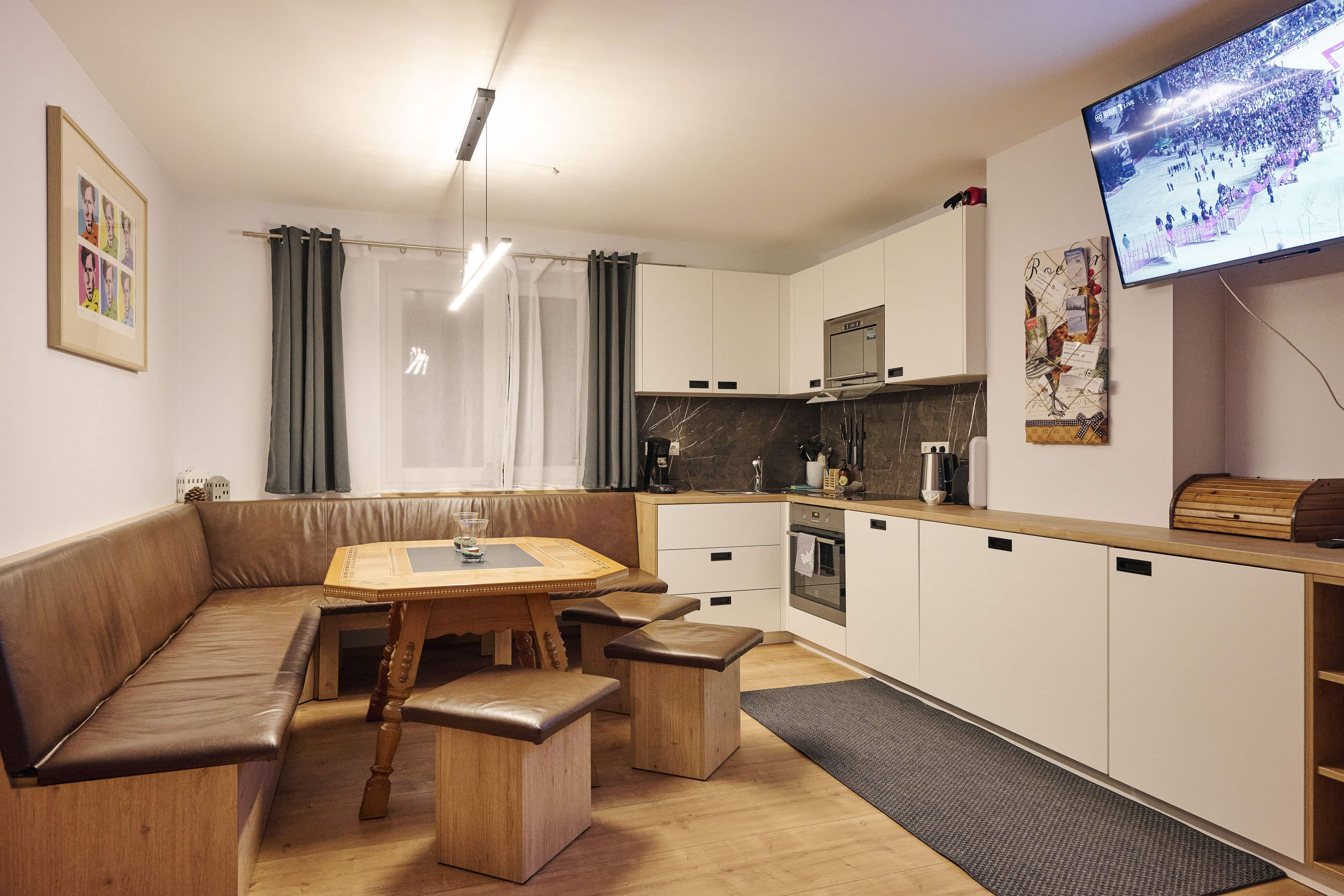 - open living room with a kitchen (4 cooktops), oven, micro wave, dish washer, fridge and coffee pad machine, toaster, kettle, cable-TV, radio, safe und free W-WIFI